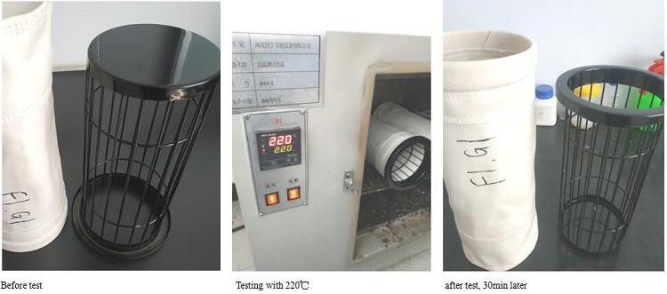 Example: Glass-woven Filter bag + HTPC cage test, 30 min later, cage surface no significant changes, no bonding between bag and cage