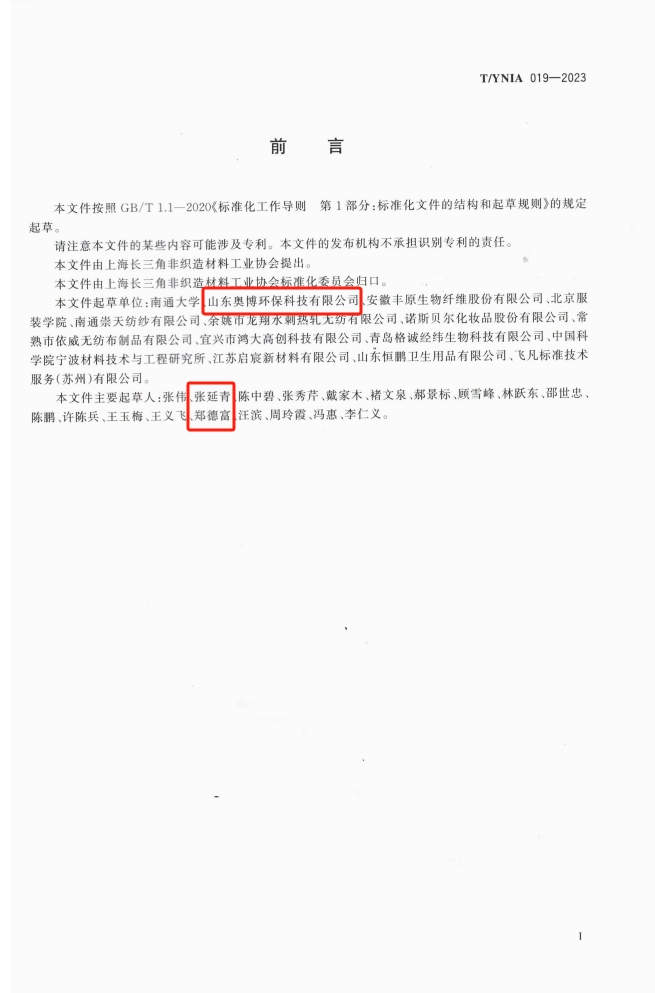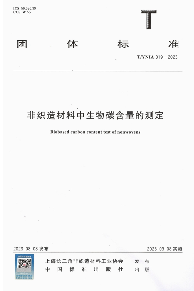 團體標準T/YNIA 019-2023《非織造材料中生物碳含量的測定》,由上海長三角非織造材料工業(yè)協(xié)會發(fā)布,山東奧博環(huán)保科技有限公司為主要起草和完成單位。